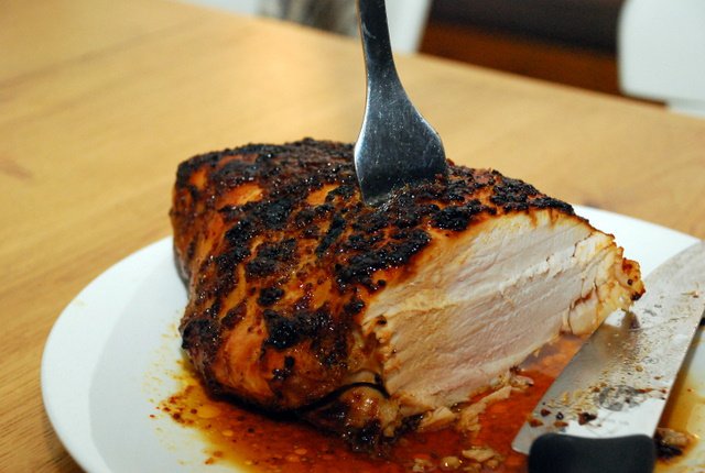מוציאים את התבנית מהתנור, מוציאים את הנתח מהתבנית ומניחים על צלחת הגשה או על קרש חיתוך. אני יוצק על הנתח כמה כפות של שאריות הרוטב מהתבנית. פורסים בעזרת סכין חד את הנתח לפרוסות. אני אוהב לאכול את זה כשזה חם, אבל זה גם טעים קר מהמקרר. אפשר להגיש את זה לארוחה כשזה חם על קרש חיתוך. האורחים ילקקו את האצבעות.