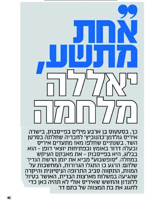 חוץ מזה, איריס הפכה להיות מיני-סלב בסוף השבוע לאחר פרסום הכתבה ב"מעריב סופשבוע" על ההתמודדות שלנו עם הסרטן דרך הבלוג והפייסבוק. בכתבה ערכו קטעים מתוך הבלוג שלי ומתוך הפייסבוק של איריס כיומן התמודדות עם המחלה. היה מרגש למרות שהכרתי את הטקסטים.