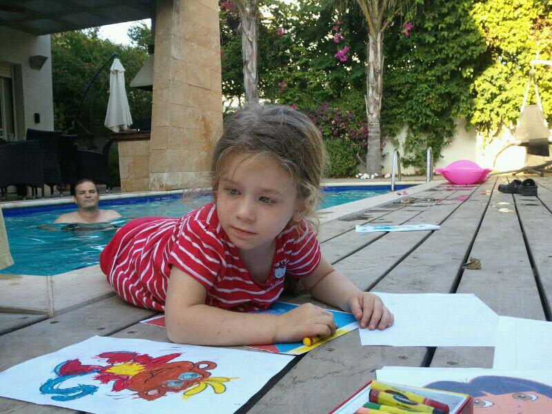 אחרי ההופעה נסענו לבקר את איריס באיכילוב. דר שוב התרגשה ללבוש את המסכה ולהכנס לחדר של איריס. ביקרנו אותה כשעה בצהרים ואחר כך שמנו פעמינו לבריכה של אריק ודיצה. כשהגענו אמרתי לאריק שהבית שלהם מזכיר לי את "מלון הצפון" בקרית שמונה בשנות התשעים, כשהיו מורידים את החיילים מהקו בלבנון להתאוורר שם ולהתרחץ בבריכה לכמה שעות ואז מחזירים אותם לקו. "רק תתלו שלט של האגודה למען החייל בכניסה, או יותר נכון – האגודה למען הסרטן", אמרתי להם. איזה אנשים נפלאים. דר נהנתה לשחות בבריכה עם אריק ואיתי ואחר כך לי, הבת של אריק ודיצה, לקחה פיקוד על דר לכמה שעות והן ציירו ביחד.