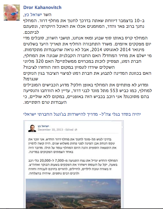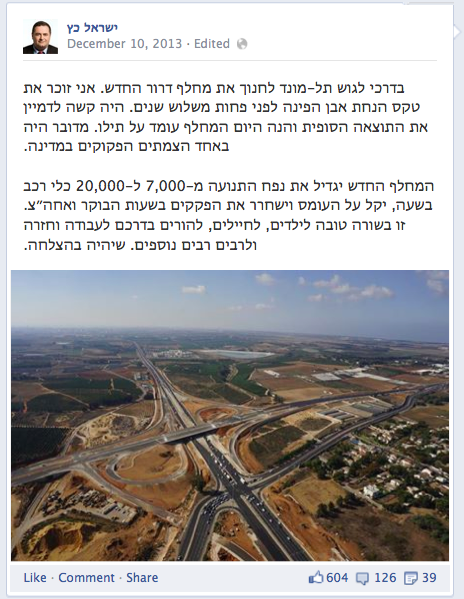 בעשרה בדצמבר 2013 פרסם שר התחבורה, ישראל כץ, את הדברים הבאים בדף הפייסבוק שלו: